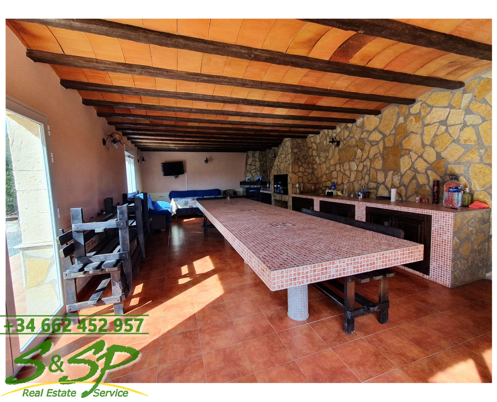 Outside, the recreational area is a real highlight. This building has a surface area of 70 m² and houses a living-dining room with capacity for 30 people, ideal for celebrations and family gatherings. Equipped with another fireplace, a bathroom and a barbecue area, this space becomes the perfect place to enjoy pleasant moments outdoors, surrounded by a spectacular natural landscape.